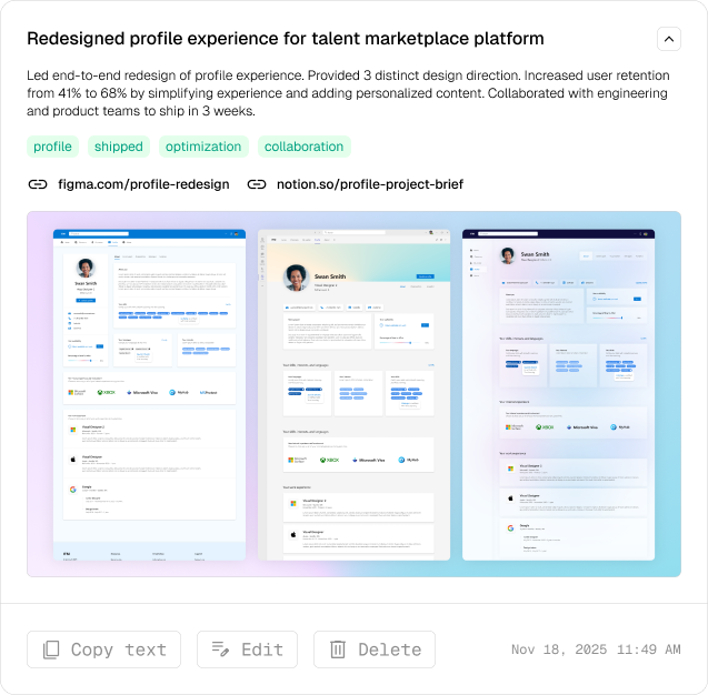 “After 4+ years designing at Microsoft, I noticed a pattern: the best performers weren't just the best at their craft, they were the best at documenting it. But who has time to track impact every month while shipping at scale?