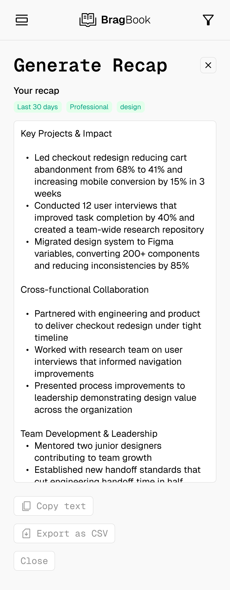 BragBook tracks your work accomplishments year-round and uses AI to instantly generate performance reviews and promotion materials.