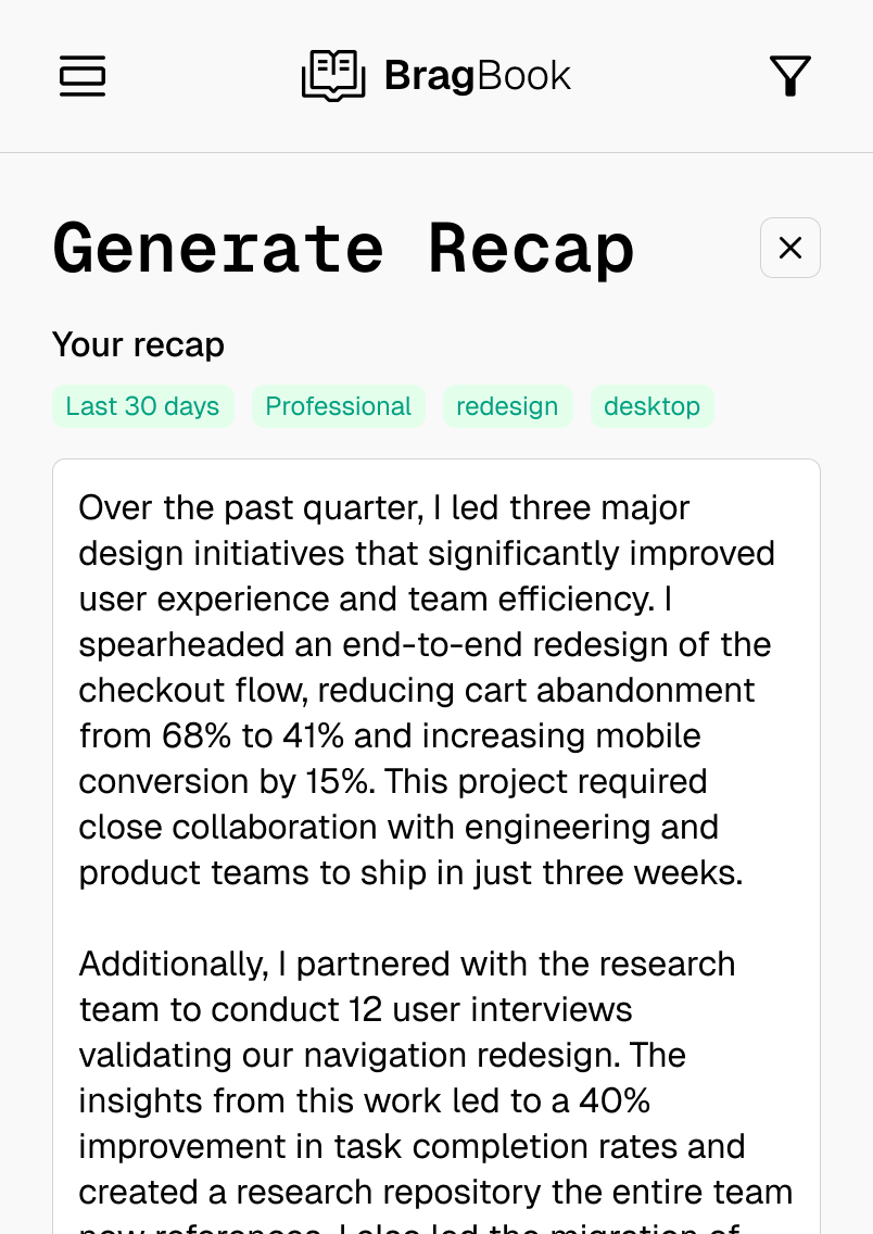 BragBook captures your daily wins and uses AI to transform them into a promotion-ready narrative in seconds.