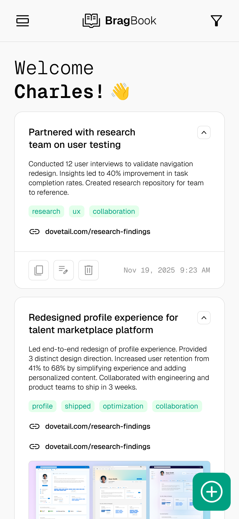 A tool for designers & product managers to quickly document their work and accomplishments, so they're always ready for performance reviews, interviews, and portfolio updates.