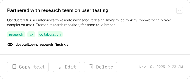 A timeline of your wins and impact, captured as you go, so you never scramble again.