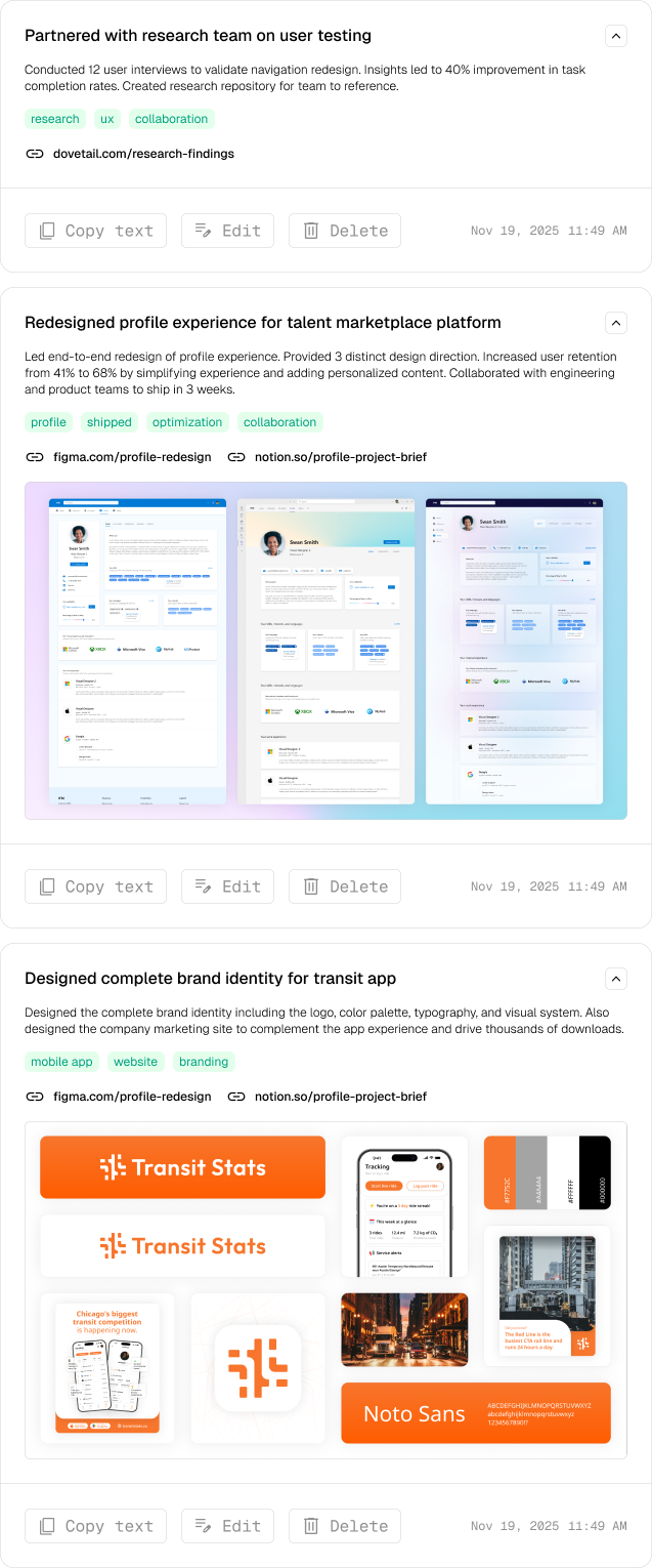 A tool for designers & product managers to quickly document their work and accomplishments, so they're always ready for performance reviews, interviews, and portfolio updates.