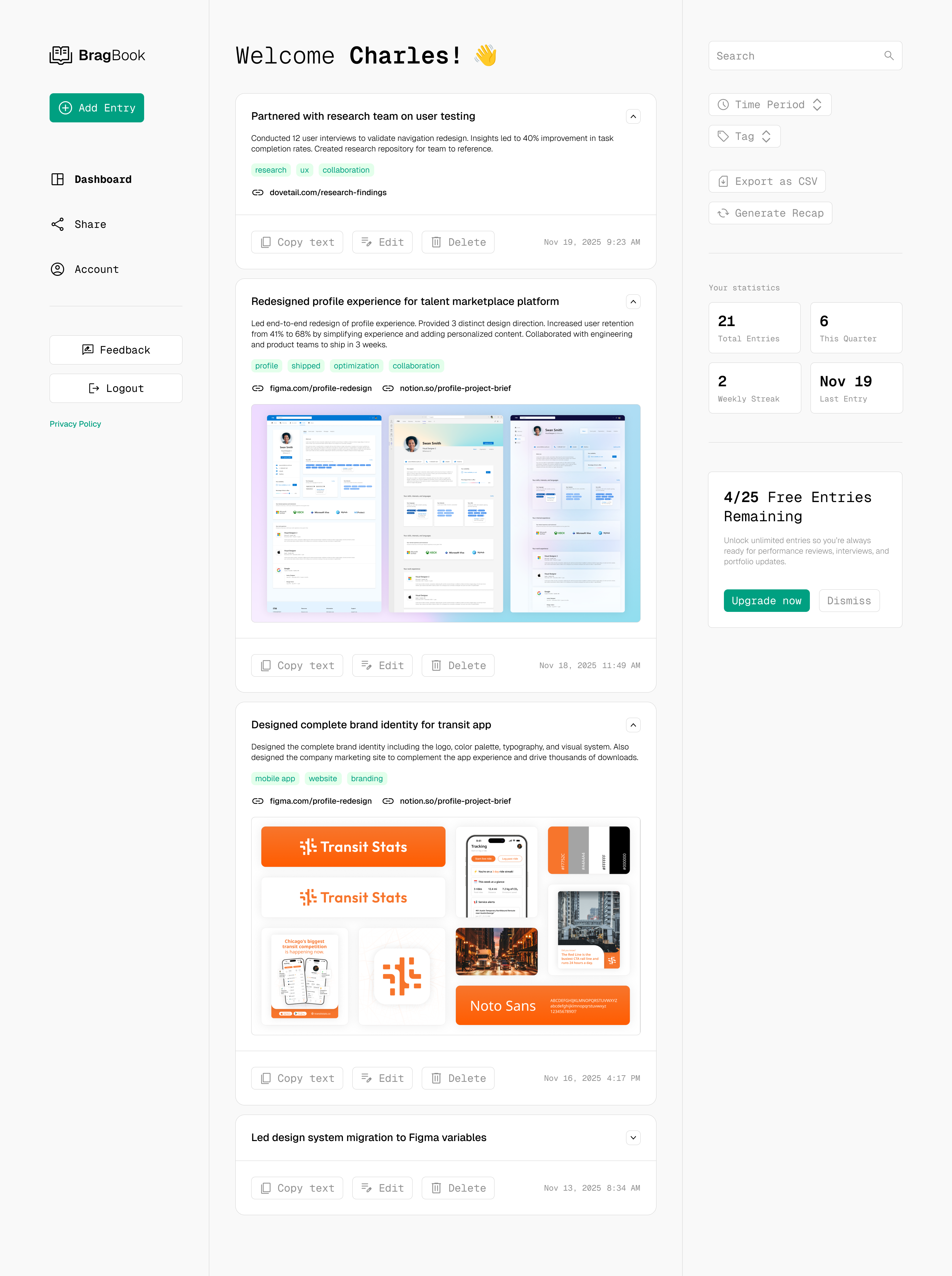 I’m building BragBook to improve the monthly review process and turn raw work into the executive-ready proof your career deserves.”